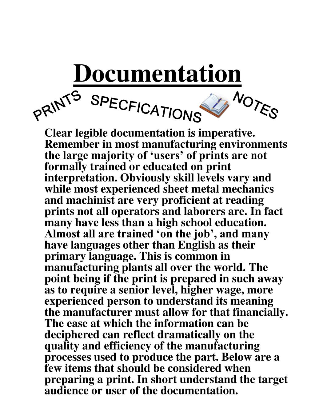 Documentation PRINTS NOTES SPECFICATIONS Clear legible documentation is imperative. Remember in most manufacturing environments the large majority of ‘users’ of prints are not formally trained or educated on print interpretation. Obviously skill levels vary and while most experienced sheet metal mechanics and machinist are very proficient at reading prints not all operators and laborers are. In fact many have less than a high school education. Almost all are trained ‘on the job’, and many have languages other than English as their primary language. This is common in manufacturing plants all over the world. The point being if the print is prepared in such away as to require a senior level, higher wage, more experienced person to understand its meaning the manufacturer must allow for that financially. The ease at which the information can be deciphered can reflect dramatically on the quality and efficiency of the manufacturing processes used to produce the part. Below are a few items that should be considered when preparing a print. In short understand the target audience or user of the documentation.