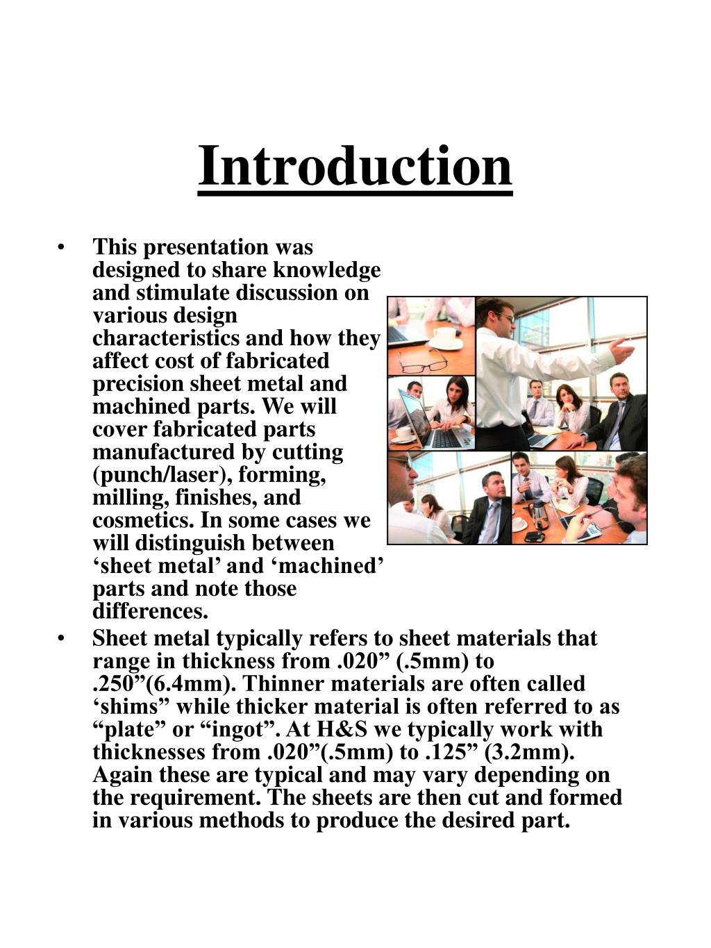 Introduction • This presentation was designed to share knowledge and stimulate discussion on various design characteristics and how they affect cost of fabricated precision sheet metal and machined parts. We will cover fabricated parts manufactured by cutting (punch/laser), forming, milling, finishes, and cosmetics. In some cases we will distinguish between ‘sheet metal’ and ‘machined’ parts and note those differences. • Sheet metal typically refers to sheet materials that range in thickness from .020” (.5mm) to .250”(6.4mm). Thinner materials are often called ‘shims” while thicker material is often referred to as “plate” or “ingot”. At H&S we typically work with thicknesses from .020”(.5mm) to .125” (3.2mm). Again these are typical and may vary depending on the requirement. The sheets are then cut and formed in various methods to produce the desired part.