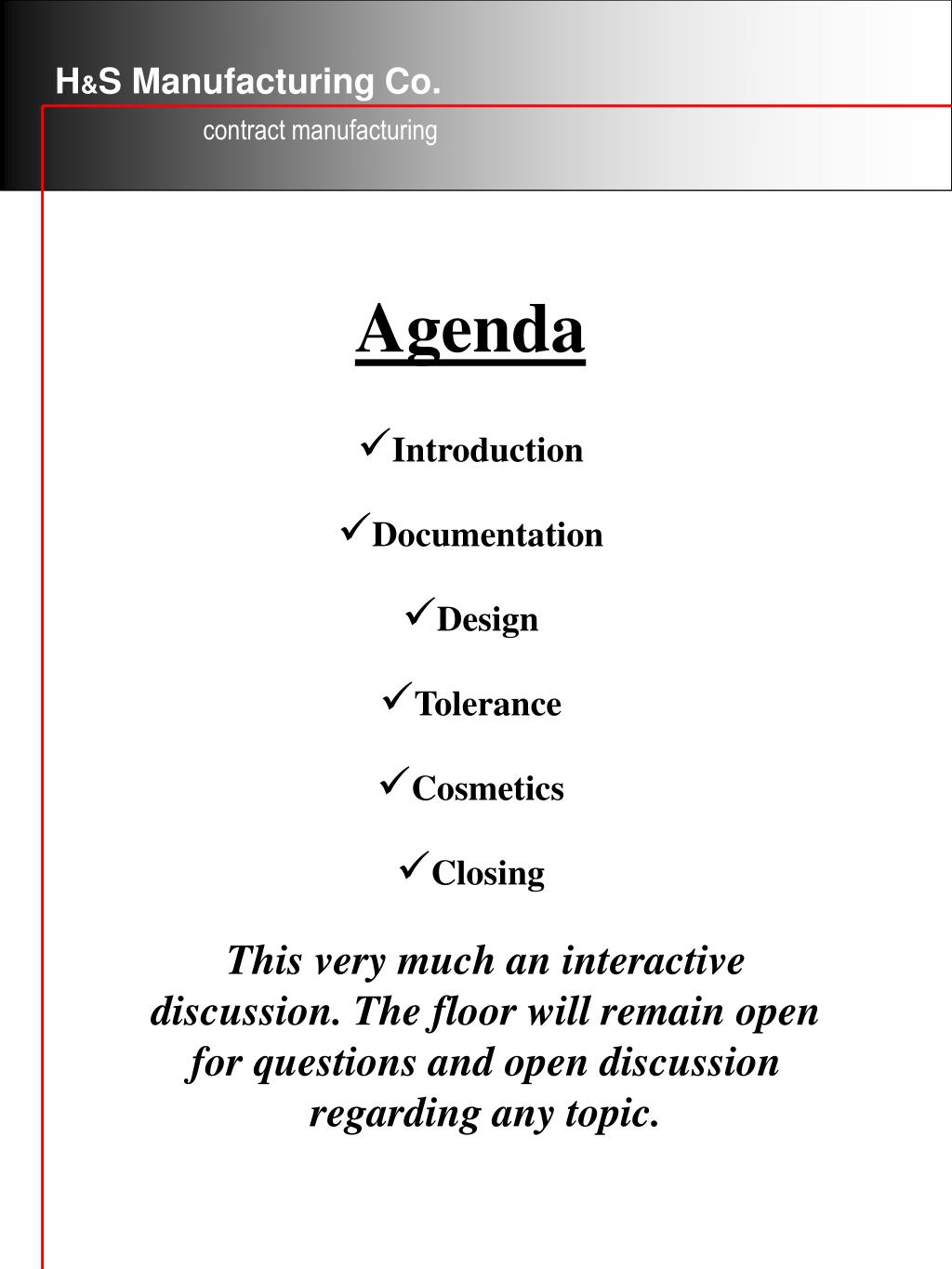 H&S Manufacturing Co. contract manufacturing • Agenda • Introduction • Documentation • Design • Tolerance • Cosmetics • Closing This very much an interactive discussion. The floor will remain open for questions and open discussion regarding any topic.