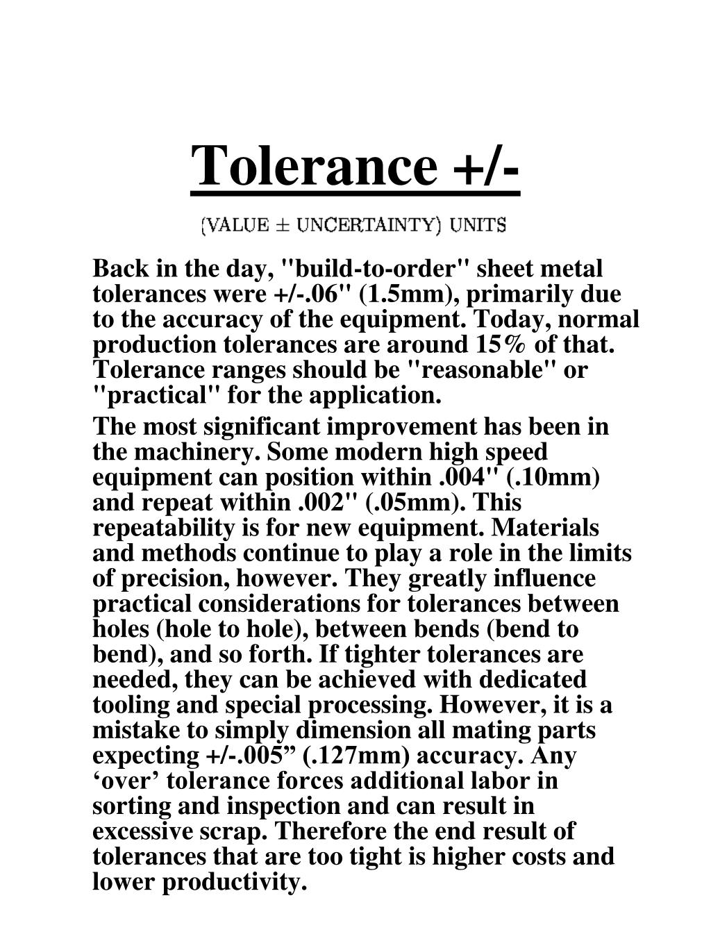 Tolerance +/- Back in the day, "build-to-order" sheet metal tolerances were +/-.06" (1.5mm), primarily due to the accuracy of the equipment. Today, normal production tolerances are around 15% of that. Tolerance ranges should be "reasonable" or "practical" for the application. The most significant improvement has been in the machinery. Some modern high speed equipment can position within .004" (.10mm) and repeat within .002" (.05mm). This repeatability is for new equipment. Materials and methods continue to play a role in the limits of precision, however. They greatly influence practical considerations for tolerances between holes (hole to hole), between bends (bend to bend), and so forth. If tighter tolerances are needed, they can be achieved with dedicated tooling and special processing. However, it is a mistake to simply dimension all mating parts expecting +/-.005” (.127mm) accuracy. Any ‘over’ tolerance forces additional labor in sorting and inspection and can result in excessive scrap. Therefore the end result of tolerances that are too tight is higher costs and lower productivity.