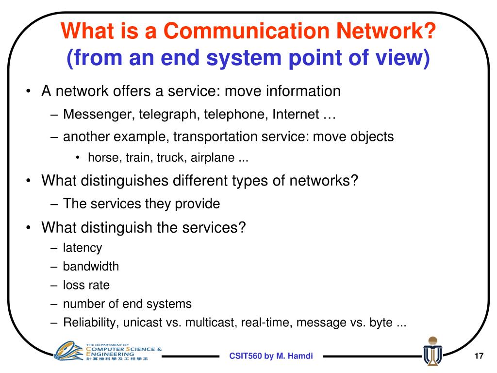What is a Communication Network?(from an end system point of view) • A network offers a service: move information • Messenger, telegraph, telephone, Internet … • another example, transportation service: move objects • horse, train, truck, airplane ... • What distinguishes different types of networks? • The services they provide • What distinguish the services? • latency • bandwidth • loss rate • number of end systems • Reliability, unicast vs. multicast, real-time, message vs. byte ...