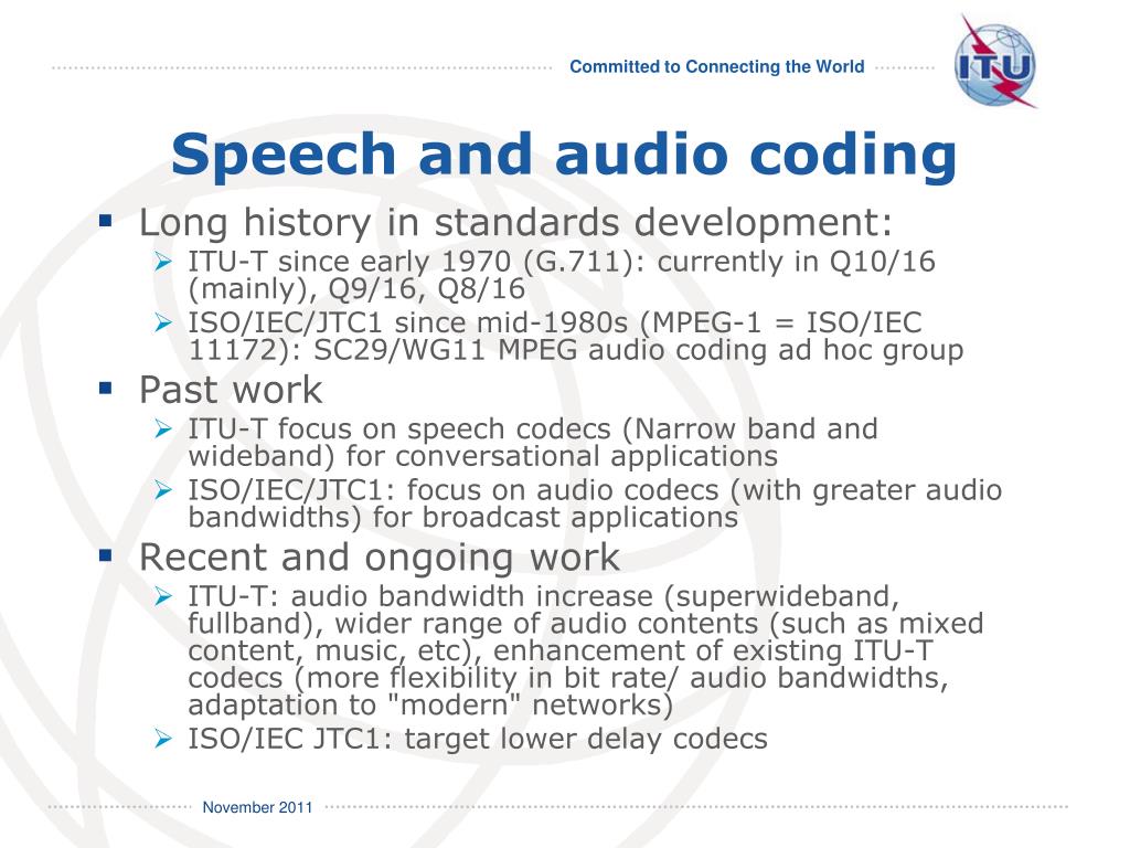 Speech and audio coding Long history in standards development: ITU-T since early 1970 (G.711): currently in Q10/16 (mainly), Q9/16, Q8/16 ISO/IEC/JTC1 since mid-1980s (MPEG-1 = ISO/IEC 11172): SC29/WG11 MPEG audio coding ad hoc group Past work ITU-T focus on speech codecs (Narrow band and wideband) for conversational applications ISO/IEC/JTC1: focus on audio codecs (with greater audio bandwidths) for broadcast applications Recent and ongoing work ITU-T: audio bandwidth increase (superwideband, fullband), wider range of audio contents (such as mixed content, music, etc), enhancement of existing ITU-T codecs (more flexibility in bit rate/ audio bandwidths, adaptation to "modern" networks) ISO/IEC JTC1: target lower delay codecs