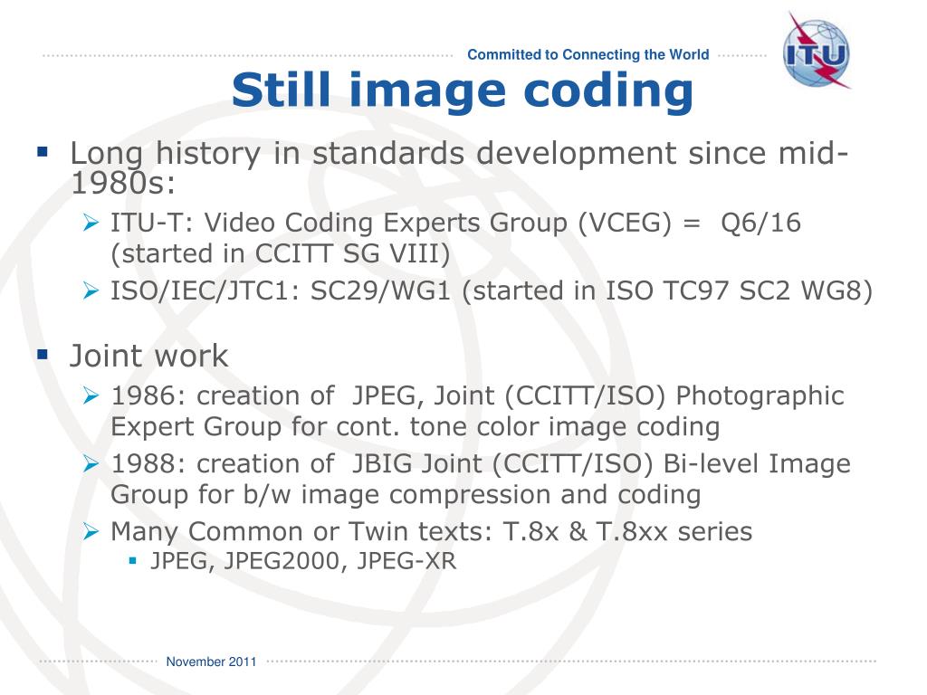 Still image coding Long history in standards development since mid-1980s: ITU-T: Video Coding Experts Group (VCEG) = Q6/16 (started in CCITT SG VIII) ISO/IEC/JTC1: SC29/WG1 (started in ISO TC97 SC2 WG8) Joint work 1986: creation of JPEG, Joint (CCITT/ISO) Photographic Expert Group for cont. tone color image coding 1988: creation of JBIG Joint (CCITT/ISO) Bi-level Image Group for b/w image compression and coding Many Common or Twin texts: T.8x & T.8xx series JPEG, JPEG2000, JPEG-XR