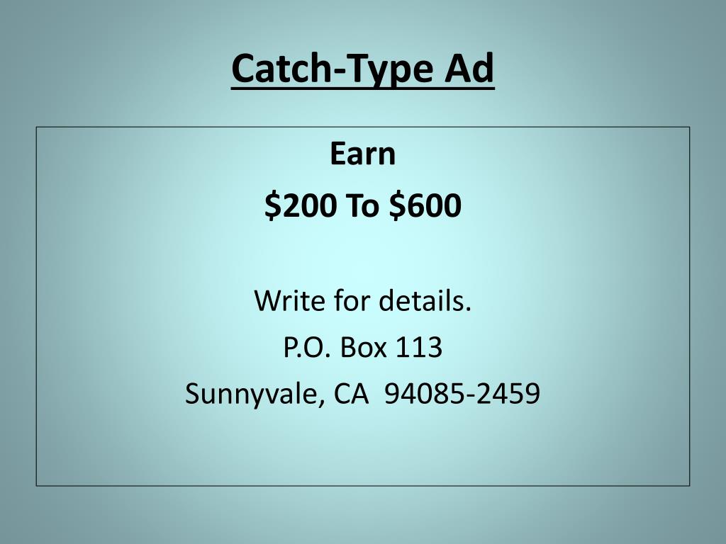 Catch-Type Ad Earn $200 To $600 Write for details. P.O. Box 113 Sunnyvale, CA 94085-2459