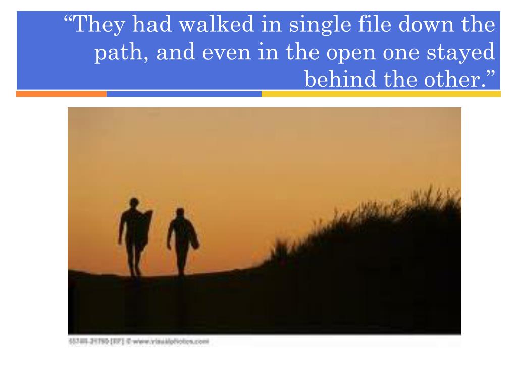 “They had walked in single file down the path, and even in the open one stayed behind the other.”