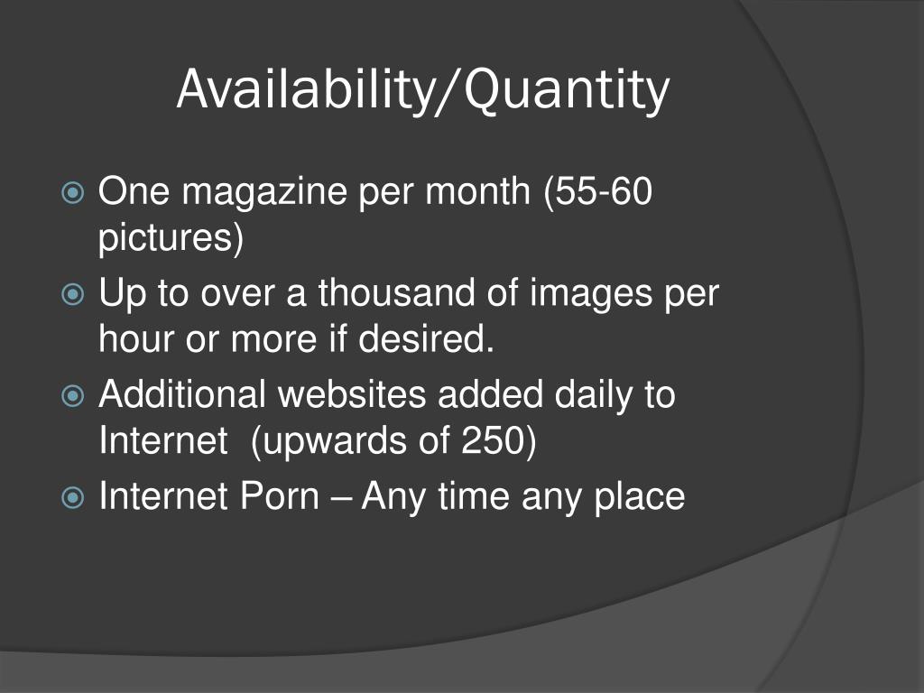 Availability/Quantity • One magazine per month (55-60 pictures) • Up to over a thousand of images per hour or more if desired. • Additional websites added daily to Internet (upwards of 250) • Internet Porn – Any time any place