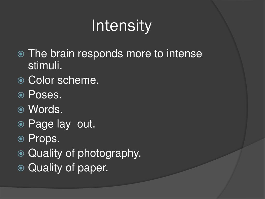 Intensity • The brain responds more to intense stimuli. • Color scheme. • Poses. • Words. • Page lay out. • Props. • Quality of photography. • Quality of paper.