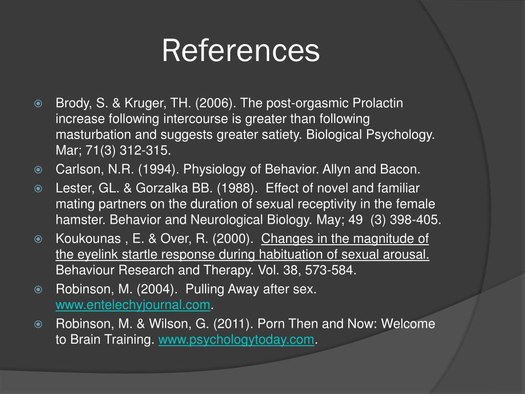 References • Brody, S. & Kruger, TH. (2006). The post-orgasmic Prolactin increase following intercourse is greater than following masturbation and suggests greater satiety. Biological Psychology. Mar; 71(3) 312-315. • Carlson, N.R. (1994). Physiology of Behavior. Allyn and Bacon. • Lester, GL. & Gorzalka BB. (1988). Effect of novel and familiar mating partners on the duration of sexual receptivity in the female hamster. Behavior and Neurological Biology. May; 49 (3) 398-405. • Koukounas , E. & Over, R. (2000). Changes in the magnitude of the eyelink startle response during habituation of sexual arousal. Behaviour Research and Therapy. Vol. 38, 573-584. • Robinson, M. (2004). Pulling Away after sex. www.entelechyjournal.com. • Robinson, M. & Wilson, G. (2011). Porn Then and Now: Welcome to Brain Training. www.psychologytoday.com.
