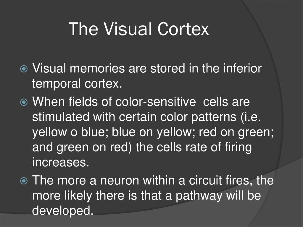 The Visual Cortex • Visual memories are stored in the inferior temporal cortex. • When fields of color-sensitive cells are stimulated with certain color patterns (i.e. yellow o blue; blue on yellow; red on green; and green on red) the cells rate of firing increases. • The more a neuron within a circuit fires, the more likely there is that a pathway will be developed.