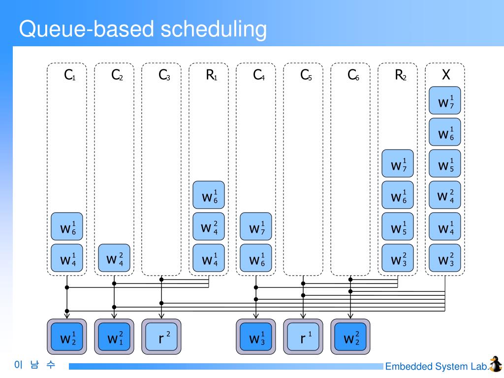Queue-based scheduling C C C R C C C R X 1 2 3 1 4 5 6 2 w 1 7 w 1 6 w 1 7 w 1 5 w w 1 6 w 1 6 2 4 w w 1 6 2 4 w 1 7 w 1 5 w 1 4 w w 1 4 2 4 w 1 4 w 1 6 w 2 3 w 2 3 w 1 2 w 2 1 r 2 w 1 3 r 1 w 2 2