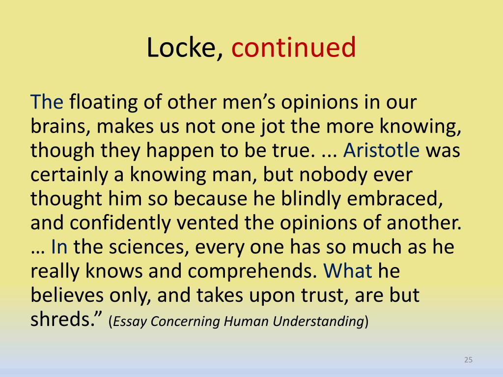 Locke, continued The floating of other men’s opinions in our brains, makes us not one jot the more knowing, though they happen to be true. ... Aristotle was certainly a knowing man, but nobody ever thought him so because he blindly embraced, and confidently vented the opinions of another. … In the sciences, every one has so much as he really knows and comprehends. What he believes only, and takes upon trust, are but shreds.” (Essay Concerning Human Understanding)