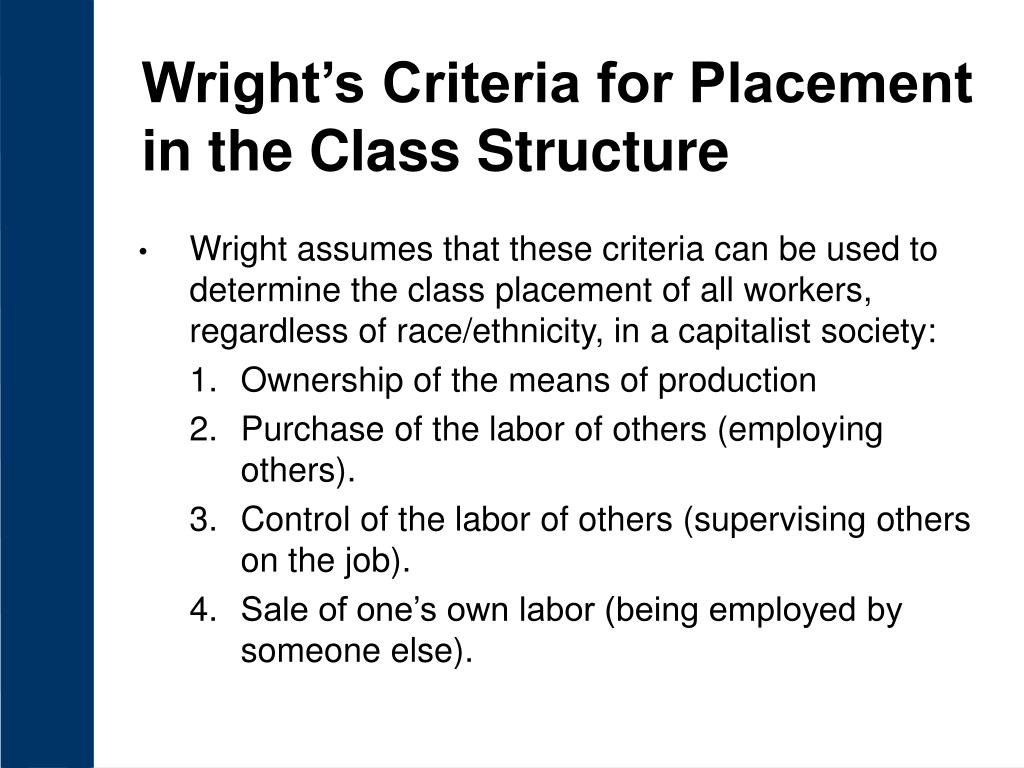 Wright’s Criteria for Placement in the Class Structure • Wright assumes that these criteria can be used to determine the class placement of all workers, regardless of race/ethnicity, in a capitalist society: • Ownership of the means of production • Purchase of the labor of others (employing others). • Control of the labor of others (supervising others on the job). • Sale of one’s own labor (being employed by someone else).