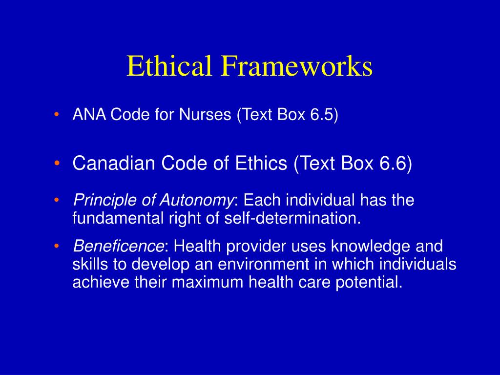 Ethical Frameworks • ANA Code for Nurses (Text Box 6.5) • Canadian Code of Ethics (Text Box 6.6) • Principle of Autonomy: Each individual has the fundamental right of self-determination. • Beneficence: Health provider uses knowledge and skills to develop an environment in which individuals achieve their maximum health care potential.