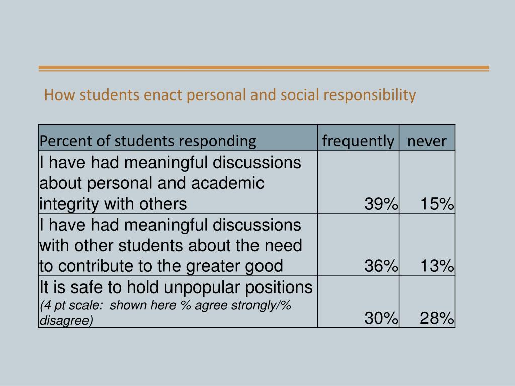 Declining perceptions of personal & social responsibility from first year to senior year Differences in how the current campus focus is perceived
