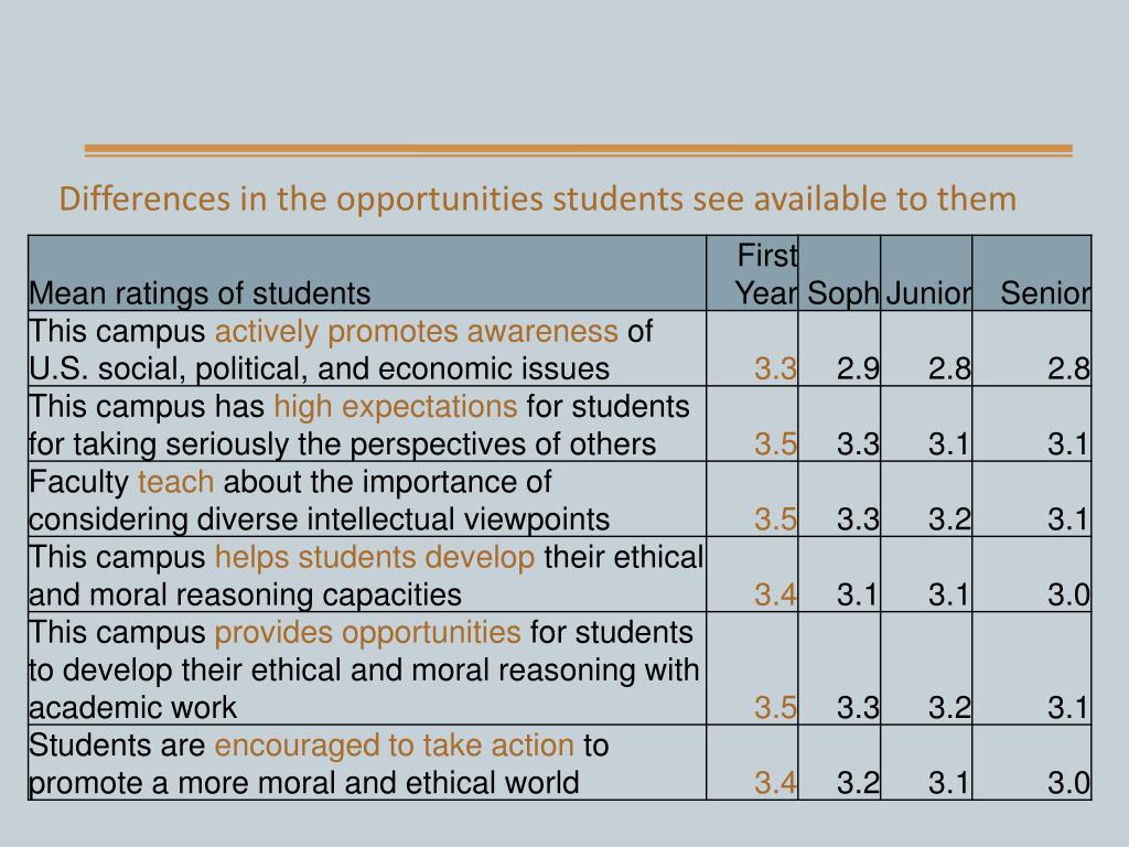 cont. • students are respectful of one another when discussing controversial issues, perspectives, and points of view* • campus actively promotes awareness of US and global social, political and economic issues • both class room experiences and out-of class activities are powerful learning experiences