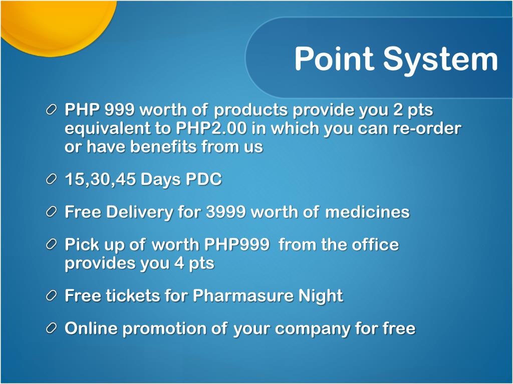 Point System • PHP 999 worth of products provide you 2 pts equivalent to PHP2.00 in which you can re-order or have benefits from us • 15,30,45 Days PDC • Free Delivery for 3999 worth of medicines • Pick up of worth PHP999 from the office provides you 4 pts • Free tickets for Pharmasure Night • Online promotion of your company for free