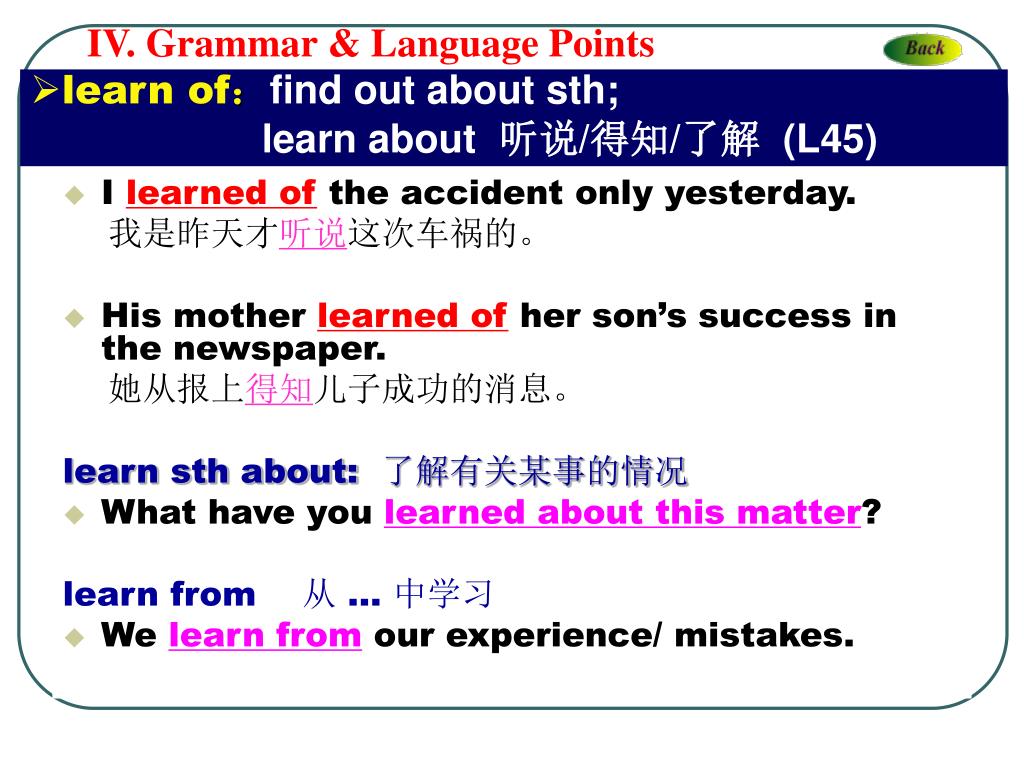 IV. Grammar & Language Points learn of:find out about sth; learn about听说/得知/了解 (L45) • I learned of the accident only yesterday. 我是昨天才听说这次车祸的。 • His mother learned of her son’s success in the newspaper. 她从报上得知儿子成功的消息。 learn sth about: 了解有关某事的情况 • What have you learned about this matter? learn from 从 … 中学习 • We learn from our experience/ mistakes.