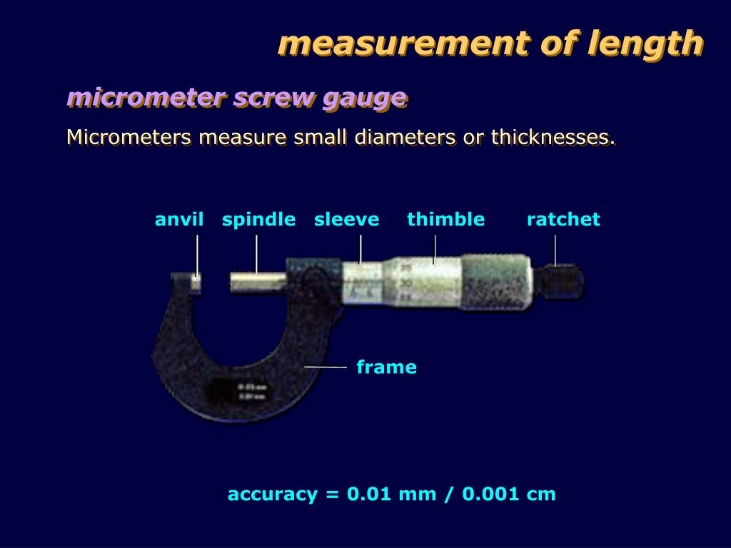 measurement of length micrometer screw gauge Micrometers measure small diameters or thicknesses. anvil spindle sleeve thimble ratchet frame accuracy = 0.01 mm / 0.001 cm
