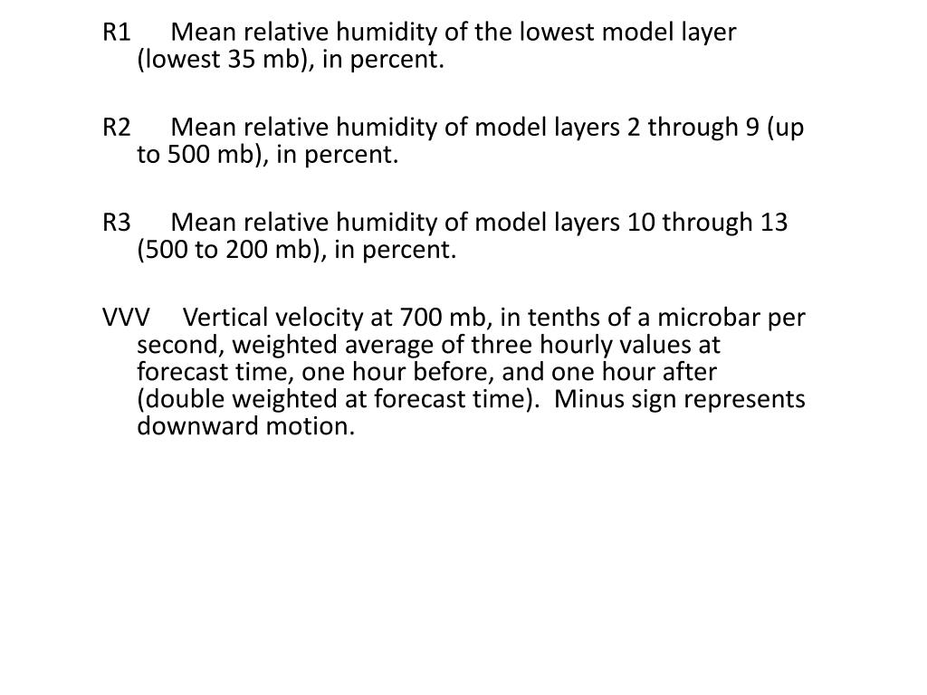 R1 Mean relative humidity of the lowest model layer (lowest 35 mb), in percent. R2 Mean relative humidity of model layers 2 through 9 (up to 500 mb), in percent. R3 Mean relative humidity of model layers 10 through 13 (500 to 200 mb), in percent. VVV Vertical velocity at 700 mb, in tenths of a microbar per second, weighted average of three hourly values at forecast time, one hour before, and one hour after (double weighted at forecast time). Minus sign represents downward motion.