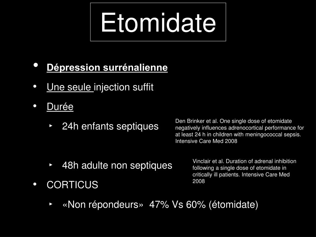 Etomidate • Dépression surrénalienne • Une seule injection suffit • Durée • 24h enfants septiques • 48h adulte non septiques • CORTICUS • «Non répondeurs» 47% Vs 60% (étomidate) Den Brinker et al. One single dose of etomidate negatively influences adrenocortical performance for at least 24 h in children with meningococcal sepsis. Intensive Care Med 2008 Vinclair et al. Duration of adrenal inhibition following a single dose of etomidate in critically ill patients. Intensive Care Med 2008