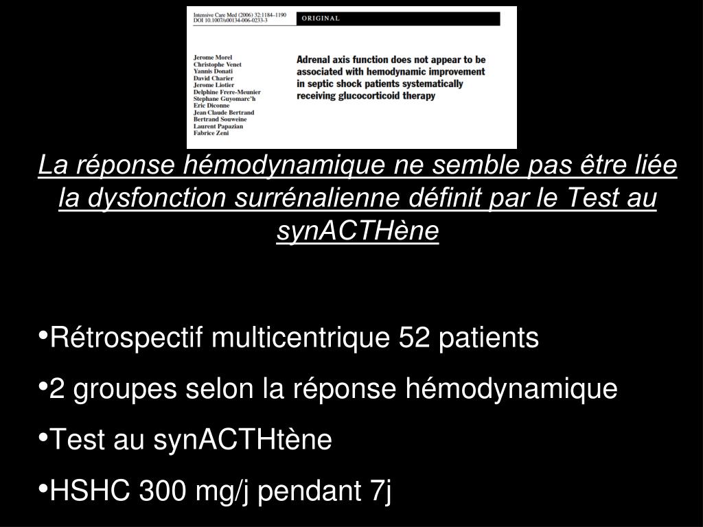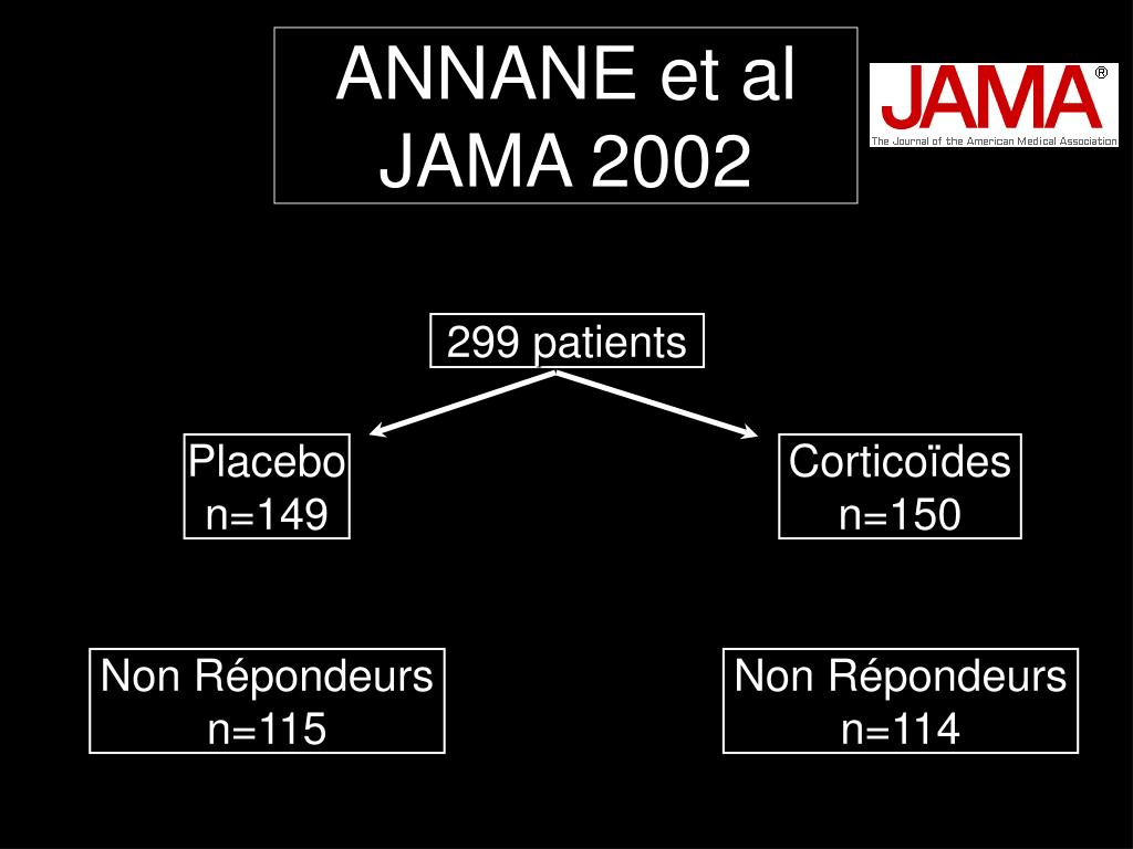 ANNANE et alJAMA 2002 • Etude multicentrique randomisée en double aveugle contre placebo • Etats septiques graves < 8h • Groupe corticoïde : HSHC 50 mg/6h et Fludrocortisone pendant 7j • Test au synACTHène