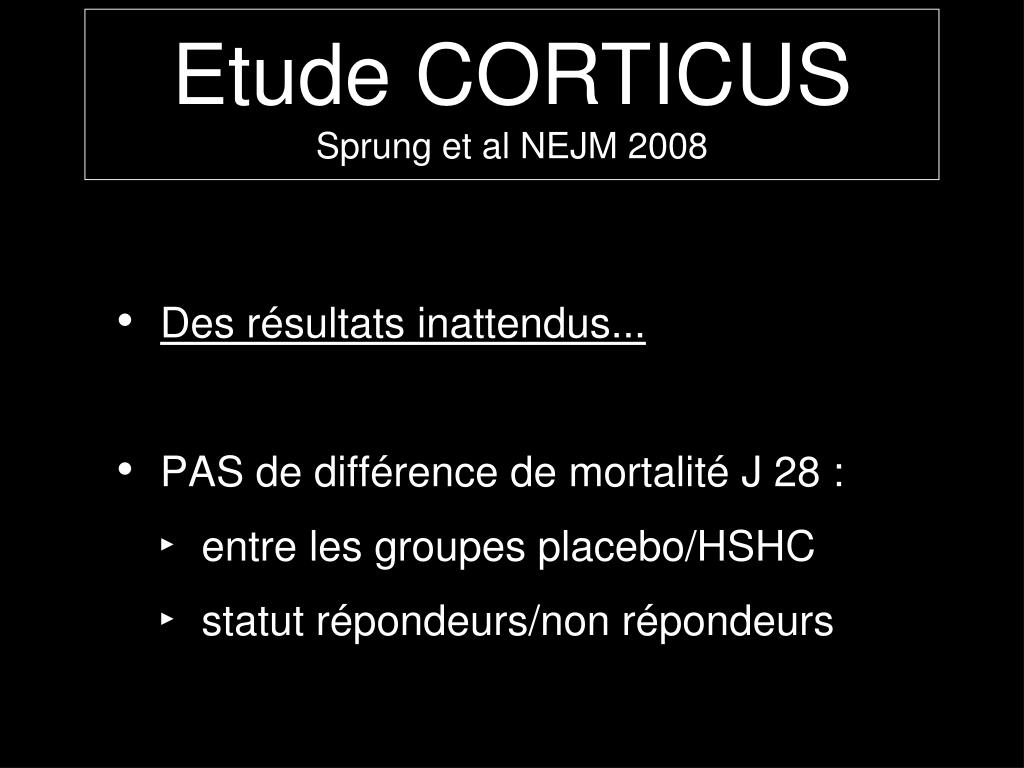 Etude CORTICUS Sprung et al NEJM 2008 • Des résultats inattendus... • PAS de différence de mortalité J 28 : • entre les groupes placebo/HSHC • statut répondeurs/non répondeurs