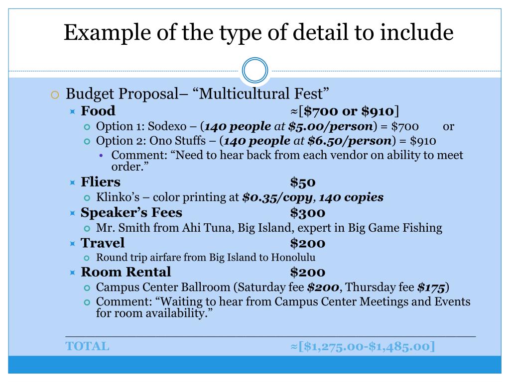 Example of the type of detail to include • Budget Proposal– “Multicultural Fest” • Food ≈[$700 or $910] • Option 1: Sodexo – (140 people at $5.00/person) = $700 or • Option 2: Ono Stuffs – (140 people at $6.50/person) = $910 • Comment: “Need to hear back from each vendor on ability to meet order.” • Fliers$50 • Klinko’s – color printing at $0.35/copy, 140 copies • Speaker’s Fees $300 • Mr. Smith from Ahi Tuna, Big Island, expert in Big Game Fishing • Travel $200 • Round trip airfare from Big Island to Honolulu • Room Rental$200 • Campus Center Ballroom (Saturday fee $200, Thursday fee $175) • Comment: “Waiting to hear from Campus Center Meetings and Events for room availability.” _________________________________________ TOTAL ≈[$1,275.00-$1,485.00]