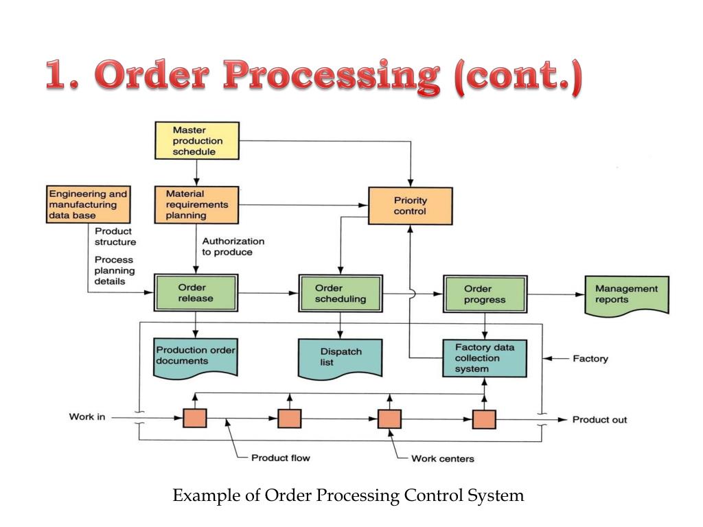 1. Order Processing (cont.) • Order processing is a key element of order fulfillment. Order processing operations or facilities are commonly called "distribution centers". • Order processing is the term generally used to describe the process or the work flow associated with the picking, packing and delivery of the packed item(s) to a shipping carrier. • The specific order fulfillment process or the operational procedures of distribution centers are determined by many factors. Each distribution center has its own unique requirements or priorities.