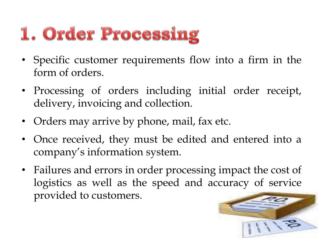 1. Order Processing • Specific customer requirements flow into a firm in the form of orders. • Processing of orders including initial order receipt, delivery, invoicing and collection. • Orders may arrive by phone, mail, fax etc. • Once received, they must be edited and entered into a company’s information system. • Failures and errors in order processing impact the cost of logistics as well as the speed and accuracy of service provided to customers.