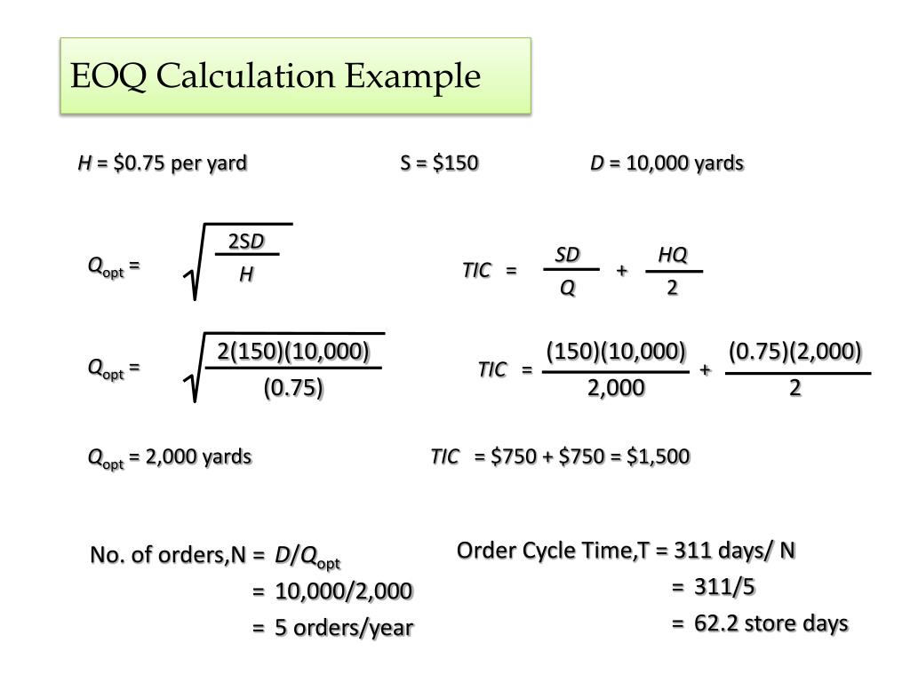 H = $0.75 per yard S = $150 D = 10,000 yards SD Q HQ 2 TIC = + Qopt = 2(150)(10,000) (0.75) (150)(10,000) 2,000 (0.75)(2,000) 2 Qopt = TIC = + 2SD H Qopt = 2,000 yards TIC = $750 + $750 = $1,500 EOQ Calculation Example Order Cycle Time,T = 311 days/ N = 311/5 = 62.2 store days No. of orders,N = D/Qopt = 10,000/2,000 = 5 orders/year