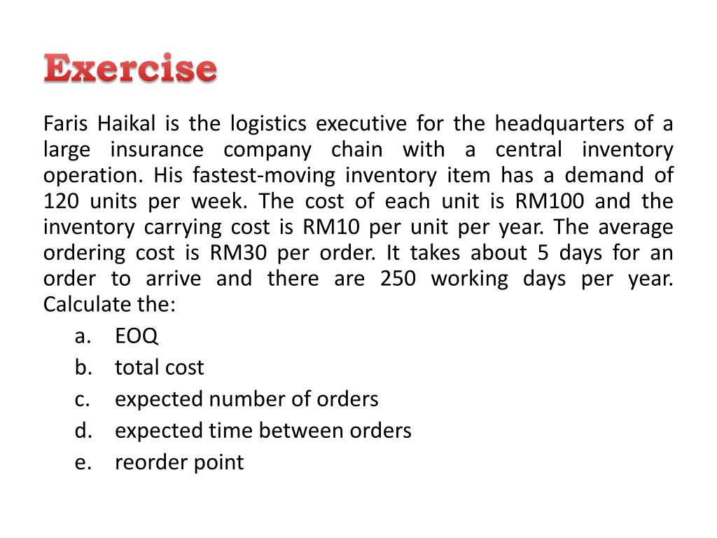 Exercise FarisHaikal is the logistics executive for the headquarters of a large insurance company chain with a central inventory operation. His fastest-moving inventory item has a demand of 120 units per week. The cost of each unit is RM100 and the inventory carrying cost is RM10 per unit per year. The average ordering cost is RM30 per order. It takes about 5 days for an order to arrive and there are 250 working days per year. Calculate the: • EOQ • total cost • expected number of orders • expected time between orders • reorder point