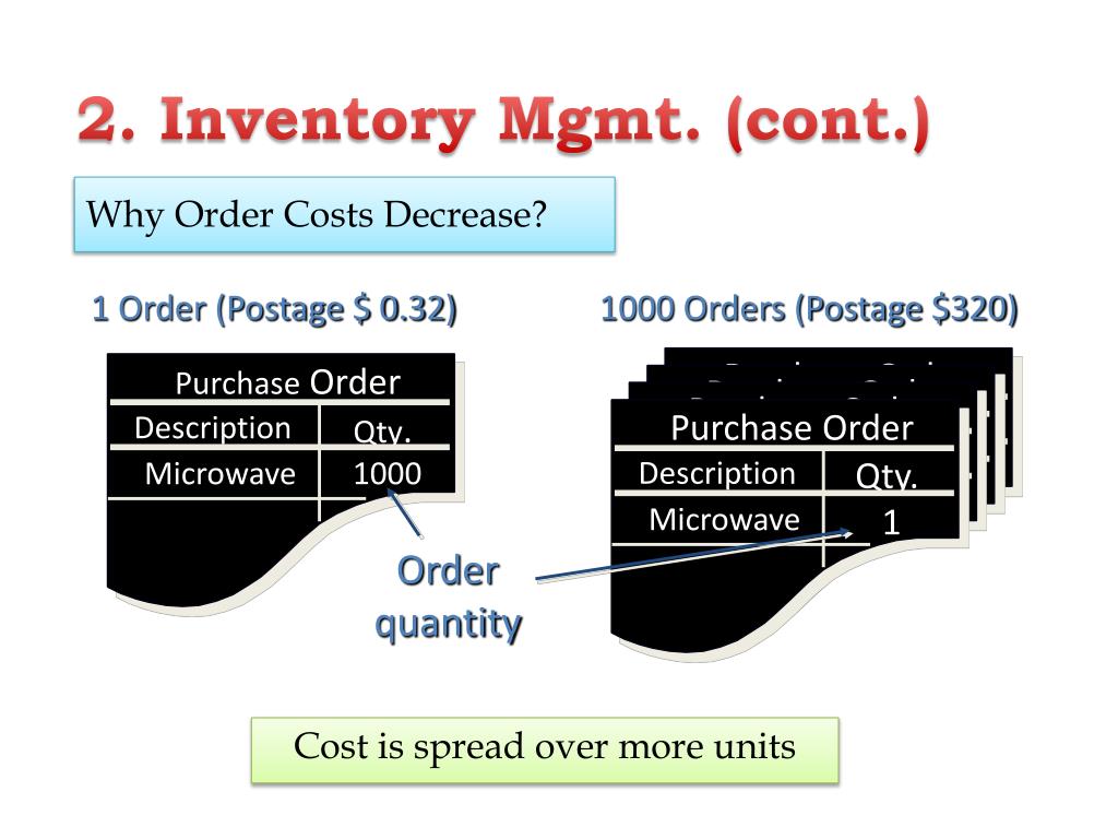 1 Order (Postage $ 0.32) 1000 Orders (Postage $320) Purchase Order Purchase Order Purchase Order Purchase Order Description Qty. Purchase Order Description Qty. Description Qty. Description Qty. Microwave 1 Description Qty. Microwave 1000 Microwave 1 Microwave 1 Microwave 1 Order quantity Why Order Costs Decrease? 2. Inventory Mgmt. (cont.) Cost is spread over more units