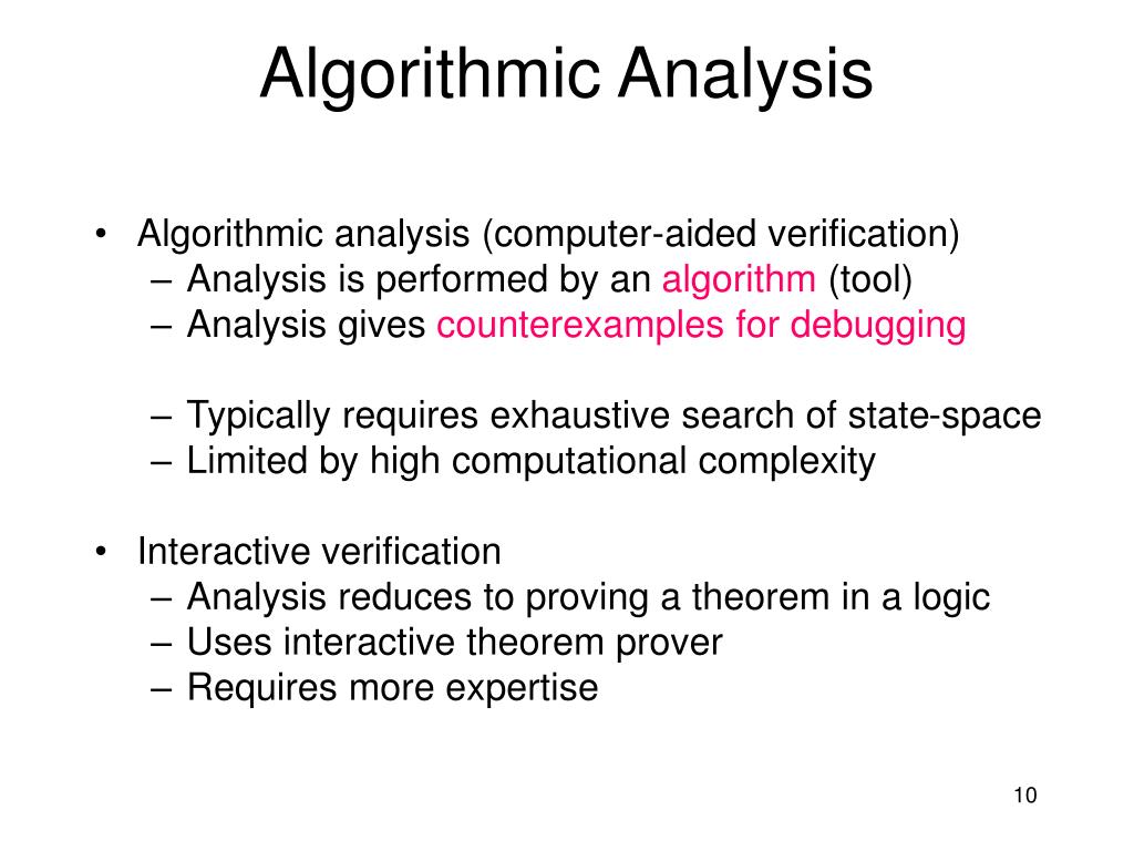 Algorithmic Analysis • Algorithmic analysis (computer-aided verification) • Analysis is performed by an algorithm (tool) • Analysis gives counterexamples for debugging • Typically requires exhaustive search of state-space • Limited by high computational complexity • Interactive verification • Analysis reduces to proving a theorem in a logic • Uses interactive theorem prover • Requires more expertise