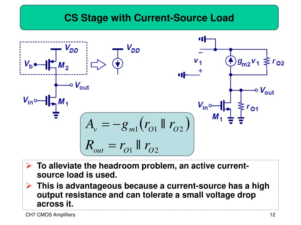CS Stage with Current-Source Load • To alleviate the headroom problem, an active current-source load is used. • This is advantageous because a current-source has a high output resistance and can tolerate a small voltage drop across it. CH7 CMOS Amplifiers