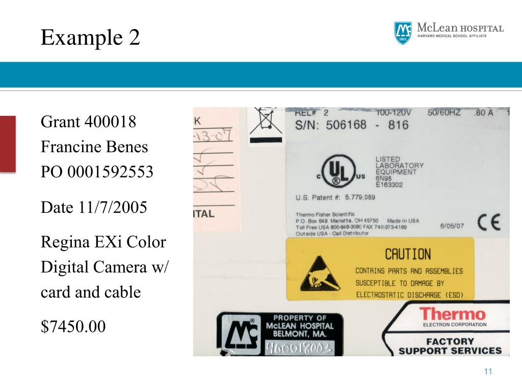 Example 2 Grant 400018 Francine Benes PO 0001592553 Date 11/7/2005 Regina EXi Color Digital Camera w/ card and cable $7450.00