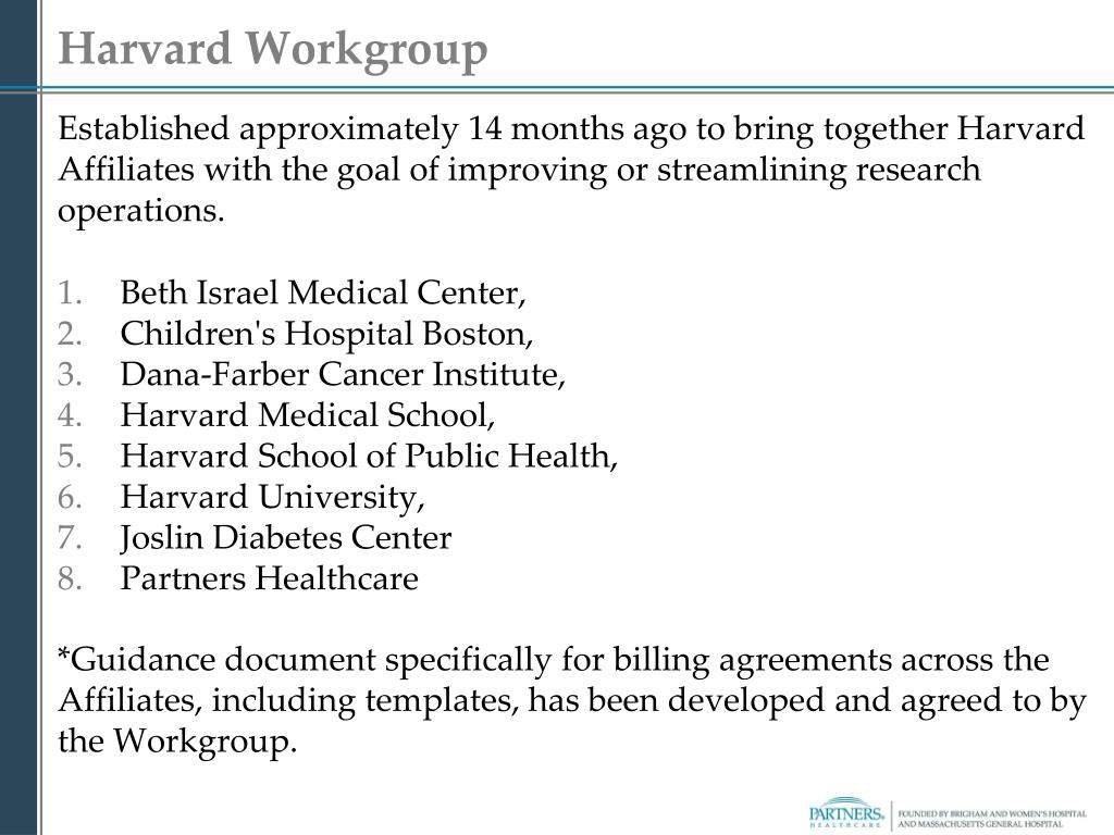 Harvard Workgroup Established approximately 14 months ago to bring together Harvard Affiliates with the goal of improving or streamlining research operations. • Beth Israel Medical Center, • Children's Hospital Boston, • Dana-Farber Cancer Institute, • Harvard Medical School, • Harvard School of Public Health, • Harvard University, • Joslin Diabetes Center • Partners Healthcare *Guidance document specifically for billing agreements across the Affiliates, including templates, has been developed and agreed to by the Workgroup.