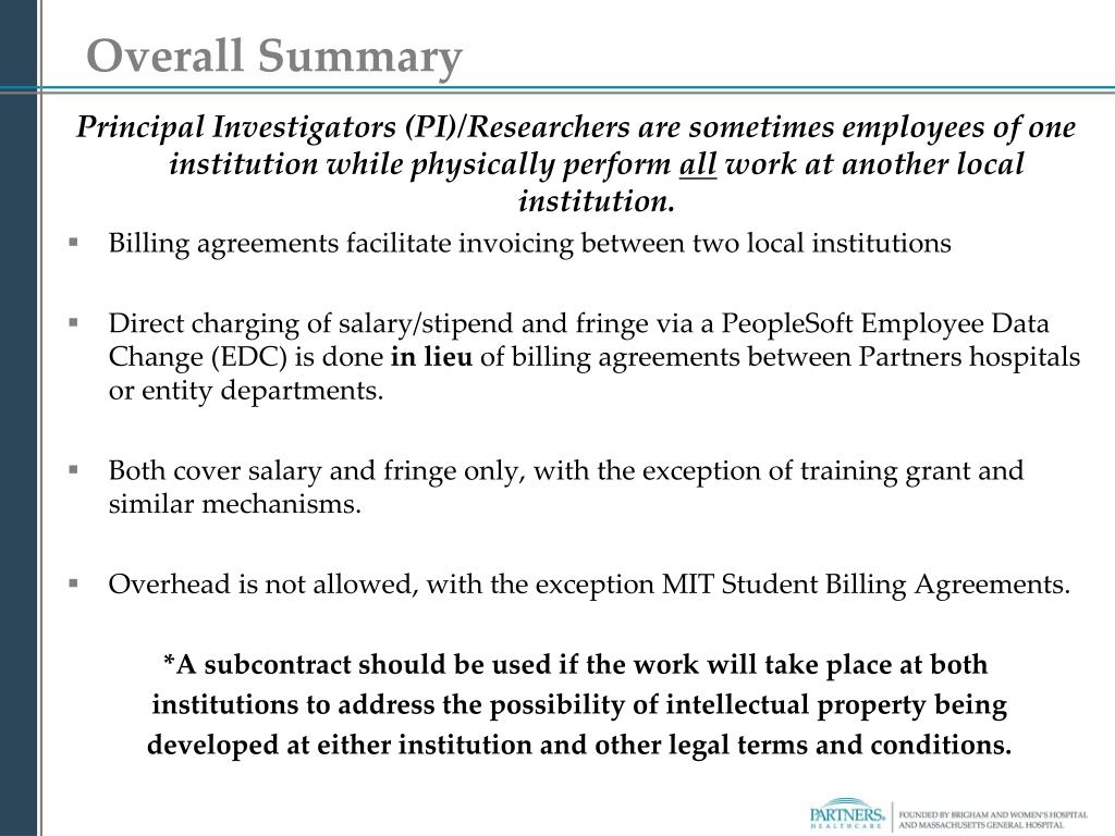 Overall Summary Principal Investigators (PI)/Researchers are sometimes employees of one institution while physically perform all work at another local institution. • Billing agreements facilitate invoicing between two local institutions • Direct charging of salary/stipend and fringe via a PeopleSoft Employee Data Change (EDC) is done in lieu of billing agreements between Partners hospitals or entity departments. • Both cover salary and fringe only, with the exception of training grant and similar mechanisms. • Overhead is not allowed, with the exception MIT Student Billing Agreements. *A subcontract should be used if the work will take place at both institutions to address the possibility of intellectual property being developed at either institution and other legal terms and conditions.