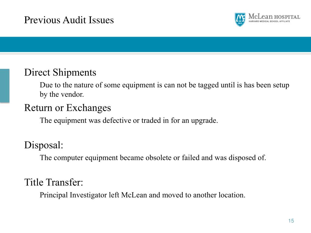 Previous Audit Issues Direct Shipments Due to the nature of some equipment is can not be tagged until is has been setup by the vendor. Return or Exchanges The equipment was defective or traded in for an upgrade. Disposal: The computer equipment became obsolete or failed and was disposed of. Title Transfer: Principal Investigator left McLean and moved to another location.