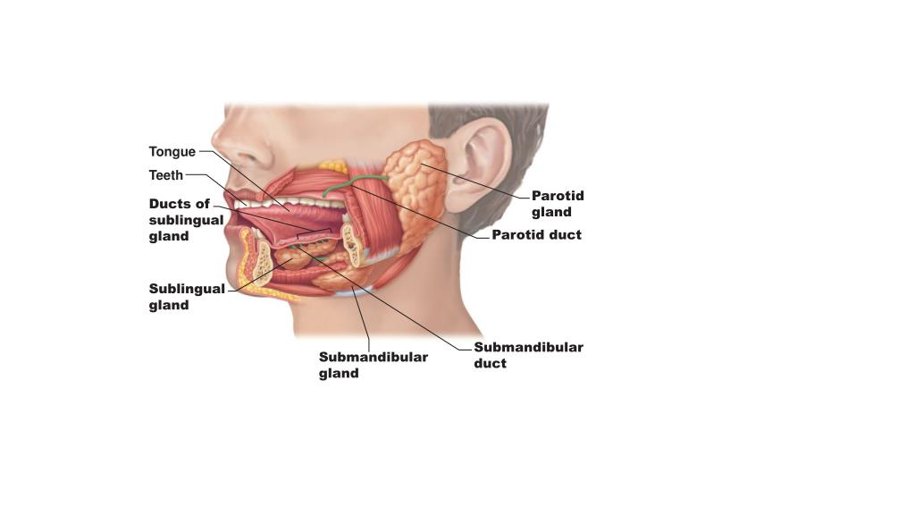 Tongue Teeth Parotid gland Ducts of sublingual gland Parotid duct Sublingual gland Submandibular duct Submandibular gland