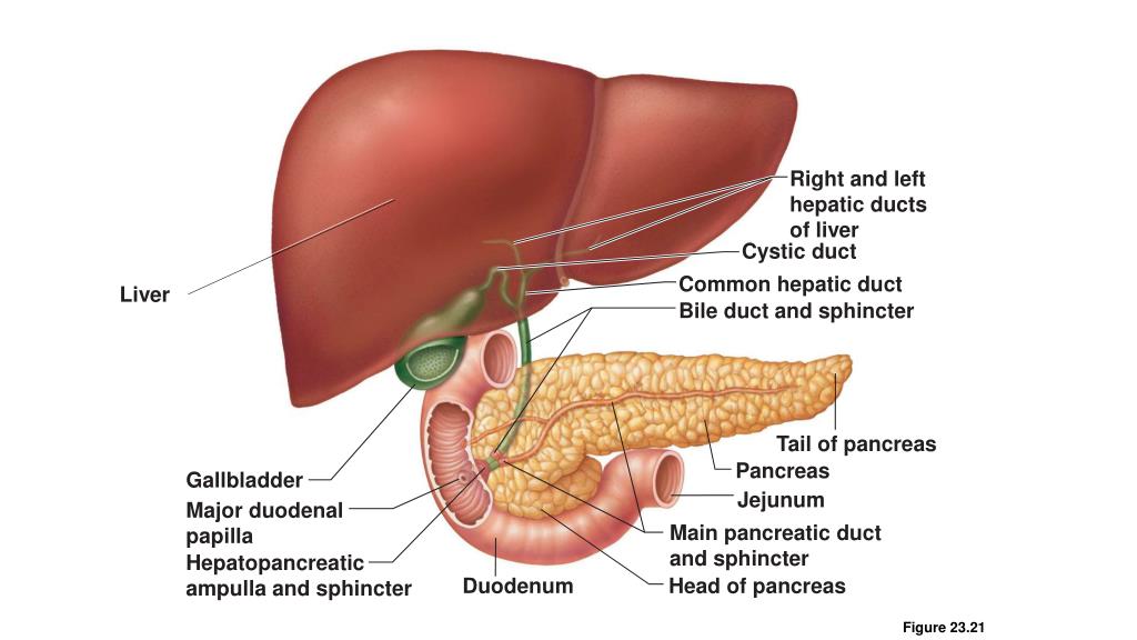 Right and left hepatic ducts of liver Cystic duct Common hepatic duct Liver Bile duct and sphincter Tail of pancreas Pancreas Gallbladder Jejunum Major duodenal papilla Main pancreatic duct and sphincter Hepatopancreatic ampulla and sphincter Duodenum Head of pancreas Figure 23.21