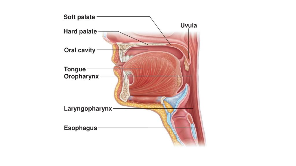 Soft palate Uvula Hard palate Oral cavity Tongue Oropharynx Laryngopharynx Esophagus