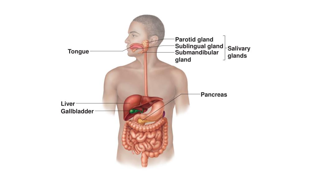 Parotid gland Sublingual gland Salivary glands Tongue Submandibular gland Pancreas Liver Gallbladder
