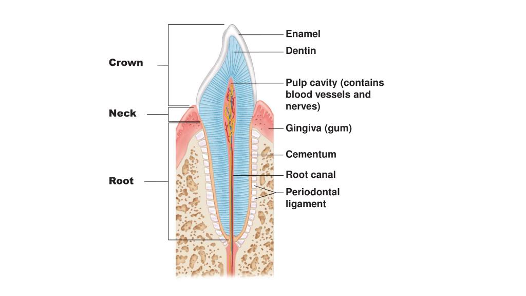 Enamel Dentin Crown Pulp cavity (contains blood vessels and nerves) Neck Gingiva (gum) Cementum Root canal Root Periodontal ligament