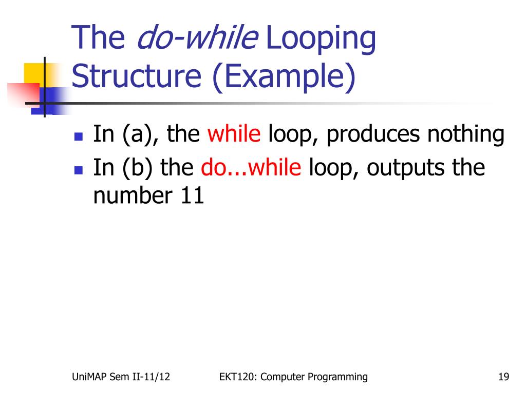 The do-while Looping Structure (Example) • Example: Consider the following two loops (a) iLoop = 11; while (iLoop <= 10) { printf("%d",iLoop); iLoop = iLoop + 5; } (b) iLoop = 11; do { printf("%d",iLoop); iLoop = iLoop + 5; } while (iLoop <= 10); EKT120: Computer Programming