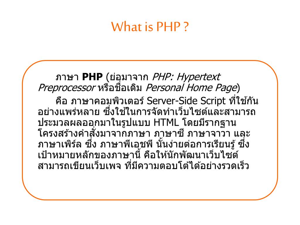 What is PHP ? ภาษา PHP (ย่อมาจาก PHP: Hypertext Preprocessor หรือชื่อเดิม Personal Home Page) คือ ภาษาคอมพิวเตอร์ Server-SideScript ที่ใช้กันอย่างแพร่หลาย ซึ่งใช้ในการจัดทำเว็บไซต์และสามารถประมวลผลออกมาในรูปแบบ HTML โดยมีรากฐานโครงสร้างคำสั่งมาจากภาษา ภาษาซี ภาษาจาวา และ ภาษาเพิร์ล ซึ่ง ภาษาพีเอชพี นั้นง่ายต่อการเรียนรู้ ซึ่งเป้าหมายหลักของภาษานี้ คือให้นักพัฒนาเว็บไซต์สามารถเขียนเว็บเพจ ที่มีความตอบโต้ได้อย่างรวดเร็ว