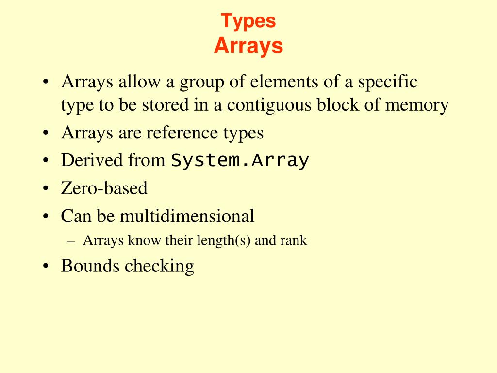 Types Arrays • Arrays allow a group of elements of a specific type to be stored in a contiguous block of memory • Arrays are reference types • Derived from System.Array • Zero-based • Can be multidimensional • Arrays know their length(s) and rank • Bounds checking