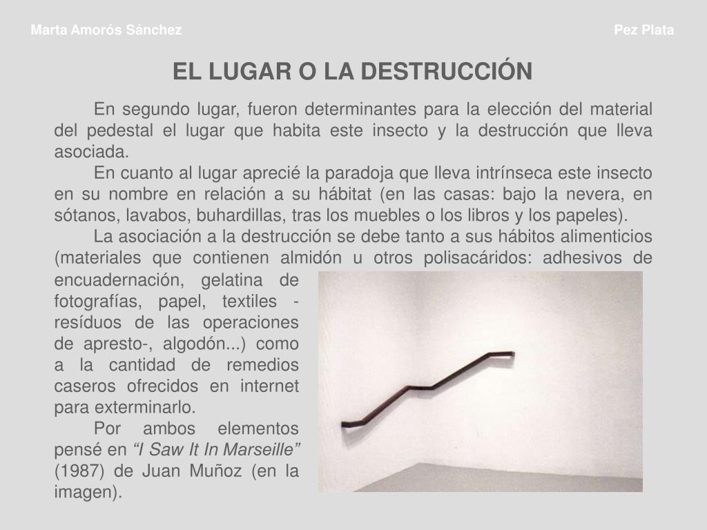 Marta Amorós Sánchez Pez Plata EL LUGAR O LA DESTRUCCIÓN En segundo lugar, fueron determinantes para la elección del material del pedestal el lugar que habita este insecto y la destrucción que lleva asociada. En cuanto al lugar aprecié la paradoja que lleva intrínseca este insecto en su nombre en relación a su hábitat (en las casas: bajo la nevera, en sótanos, lavabos, buhardillas, tras los muebles o los libros y los papeles). La asociación a la destrucción se debe tanto a sus hábitos alimenticios (materiales que contienen almidón u otros polisacáridos: adhesivos de encua encuadernación, gelatina de fotografías, papel, textiles -resíduos de las operaciones de apresto-, algodón...) como a la cantidad de remedios caseros ofrecidos en internet para exterminarlo. Por ambos elementos pensé en “I Saw It In Marseille” (1987) de Juan Muñoz (en la imagen).