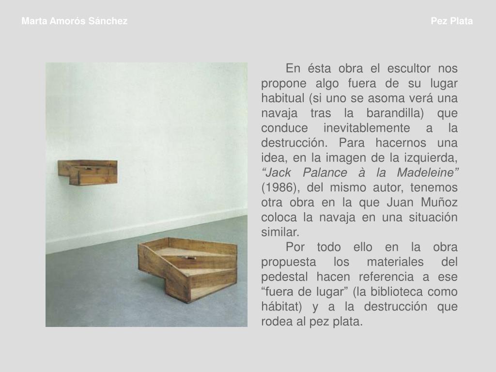 Marta Amorós Sánchez Pez Plata En ésta obra el escultor nos propone algo fuera de sulugar habitual (si uno se asoma verá una navaja tras la barandilla) que conduce inevitablemente a la destrucción. Para hacernos una idea, en la imagen de la izquierda, “Jack Palance à la Madeleine” (1986), del mismo autor, tenemos otra obra en la que Juan Muñoz coloca la navaja en una situación similar. Por todo ello en la obra propuesta los materiales del pedestal hacen referencia a ese “fuera de lugar” (la biblioteca como hábitat) y a la destrucción que rodea al pez plata.