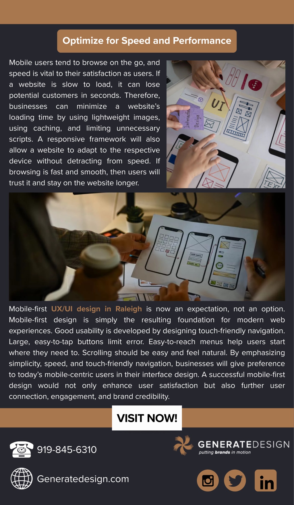 Optimize for Speed and Performance Mobile users tend to browse on the go, and speed is vital to their satisfaction as users. If a website is slow to load, it can lose potential customers in seconds. Therefore, businesses can minimize a website’s loading time by using lightweight images, using caching, and limiting unnecessary scripts. A responsive framework will also allow a website to adapt to the respective device without detracting from speed. If browsing is fast and smooth, then users will trust it and stay on the website longer. Mobile-first UX/UI design in Raleigh is now an expectation, not an option. Mobile-first design is simply the resulting foundation for modern web experiences. Good usability is developed by designing touch-friendly navigation. Large, easy-to-tap buttons limit error. Easy-to-reach menus help users start where they need to. Scrolling should be easy and feel natural. By emphasizing simplicity, speed, and touch-friendly navigation, businesses will give preference to today’s mobile-centric users in their interface design. A successful mobile-first design would not only enhance user satisfaction but also further user connection, engagement, and brand credibility. VISIT NOW! 919-845-6310 Generatedesign.com