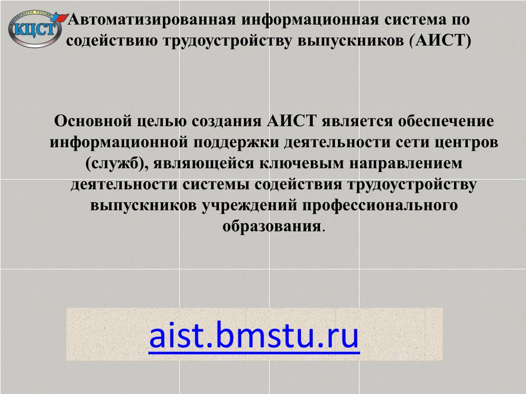 Автоматизированная информационная система по содействию трудоустройству выпускников (АИСТ) Основной целью создания АИСТ является обеспечение информационной поддержки деятельности сети центров (служб), являющейся ключевым направлением деятельности системы содействия трудоустройству выпускников учреждений профессионального образования. aist.bmstu.ru